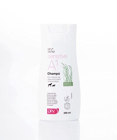 INDICACIONES DE USO: Para perros y gatos. Cuidado y limpieza del pelo y la piel hipersensible, colaborando a recuperar las condiciones fisiológicas de la piel. MODO DE EMPLEO: Uso externo. Después de mojar al animal con agua templada, aplicar DFV® DERM SENSITIVE A1 CHAMPÚ sobre el pelo. Frotar hasta formar una ligera capa de espuma. Dejar actuar el producto de 5 a 10 minutos antes de aclarar abundantemente con agua. Puede ser necesario repetir la operación inmediatamente. Frecuencia de uso: Aplicar 2 a 3 veces por semana, durante 1 2 semanas. En caso de duda, se recomienda consultar con su veterinario.